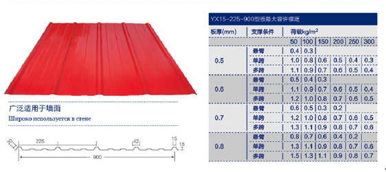 YX15-225-900型彩钢压型板是在直立锁缝层面系统的基础上,增加了一层内衬钢板。这种内衬钢板不仅对整个屋面檩条系统起到额外支撑作用,还能抵御风拔力对外屋面系统的破坏。同时,又能够保护屋面隔热材料,节约大量能源。